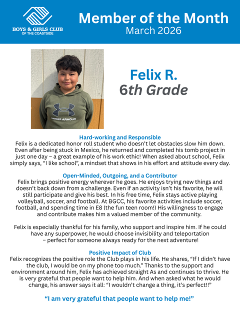 Each month the Boys & Girls Club of the Coastside recognizes one young person as Member of the Month.